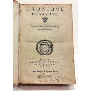 Legatura in piena pergamena rigida, dorso muto; tagli rossi. (8) -394- (2) - (26)-(1cb) pagine numerate, compreso il frontespizio; 1 tavola ripiegata fuori testo per albero genealogico; numerosi capolettera istoriati di cui il primo di garn di dimensioni. Prima edizione di questa imponente storia del Piemonte, della Savoia e...