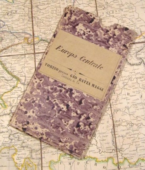 Astuccio in cartoncino coevo ricoperto da carta marmorizzata ai piatti; al piatto anteriore, etichetta con titolo coevo manoscritto. All'interno, carta geografica dell'Europa Centrale, incisa e telata all'epoca, con interventi all'acquerello d'epoca a delimitare i confini. In alto a destra, titolo e dati tipografici; lungo tutto il margine destro, elenco disposto in colonna degli stati componenti la Confederazione Germanica. Esemplare in ottimo stato conservativo sia l'astuccio, sia la carta.