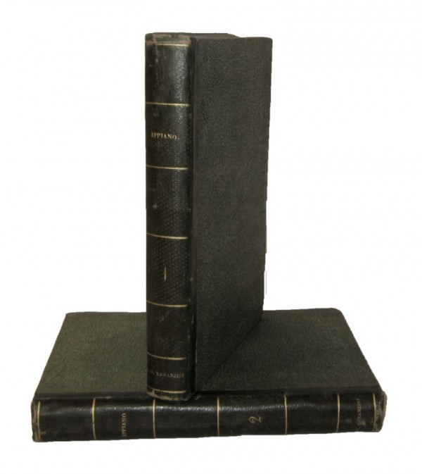 Legatura di inizio Ottocento in mezza pelle verde e carta spugnata; autore, numero di tomo, editore e filetti in oro ai dorsi, tagli spruzzati. I volume: frontespizio con titolo, testatina, marca tipografica e timbro nobiliare di possesso; 36 pagine non numerate; 275 pagine numerate con, al verso dell'ultima, registro e marca tipografica. Altro frontespizio con titolo: I TRE LIBRI DI APPIANO ALESSANDRINO DELLE GUERRE CHE I ROMANI FECERO NELLA SPAGNA...Frontespizio con testatina e marca tipografica; 4 pagine non numerate; 125 pagine numerate, l'ultima con al verso registro e marca tipografica. All'interno, numerosi capolettera e fregi a silografia. II volume: frontespizio; 24 pagine non numerate; 414 pagine numerate; 1 carta per registro e marca tipografica; numerosi capolettera e fregi a silografia. Bella edizione settecentesca di una traduzione di Appiano rivista su quella precedente cinquecentesca di Giolito. Esemplare in ottimo stato conservativo, modesti trafori di tarlo al frontespizio del primo volume e piccole fioriture a 2 carte del I volume.