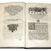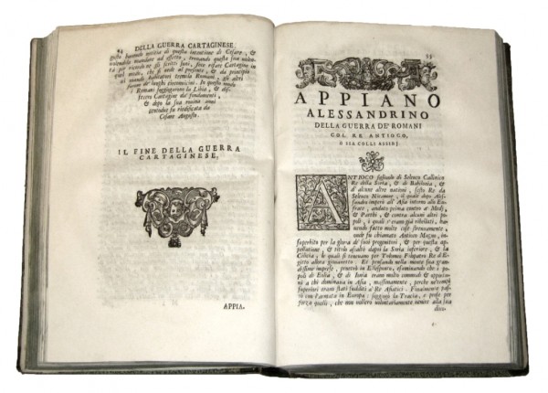 Legatura di inizio Ottocento in mezza pelle verde e carta spugnata; autore, numero di tomo, editore e filetti in oro ai dorsi, tagli spruzzati. I volume: frontespizio con titolo, testatina, marca tipografica e timbro nobiliare di possesso; 36 pagine non numerate; 275 pagine numerate con, al verso dell'ultima, registro e marca tipografica. Altro frontespizio con titolo: I TRE LIBRI DI APPIANO ALESSANDRINO DELLE GUERRE CHE I ROMANI FECERO NELLA SPAGNA...Frontespizio con testatina e marca tipografica; 4 pagine non numerate; 125 pagine numerate, l'ultima con al verso registro e marca tipografica. All'interno, numerosi capolettera e fregi a silografia. II volume: frontespizio; 24 pagine non numerate; 414 pagine numerate; 1 carta per registro e marca tipografica; numerosi capolettera e fregi a silografia. Bella edizione settecentesca di una traduzione di Appiano rivista su quella precedente cinquecentesca di Giolito. Esemplare in ottimo stato conservativo, modesti trafori di tarlo al frontespizio del primo volume e piccole fioriture a 2 carte del I volume.