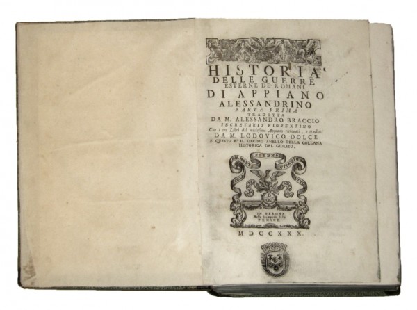 HISTORIA DELLE GUERRE ESTERNE DE' ROMANI DI APPIANO ALESSANDRINO TRADOTTA DA M. ALESSANDRO BRACCIO SECRETARIO FIORENTINO. CON I TRE LIBRI DEL MEDESIMO APPIANO RITROVATI, E TRADOTTI DA M. LODOVICO DOLCE. E QUESTO E' IL DECIMO ANELLO DELLA COLLANA HISTORICA