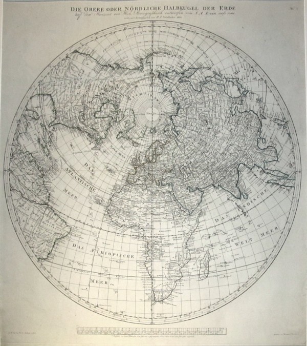 Coppia di incisioni originali eseguite su matrice di rame, colorate all'acquerello d'epoca lungo i confini; titoli e scale metriche extra-immagini ai bordi superiore e inferiore. Le due rare mappe, di grandi dimensioni, rappresentano rispettivamente il Polo Nord e il Polo Sud con raffigurazione dei territori estesi fino all'Equatore. Schrambl, fu importante cartografo austriaco che collaborò con Von Reilly, il più rinomato tra i cartografi del suo paese. Pubblicò a partire dal 1786 l' Allgemeiner Grosser Atlas che terminò nel 1800 con più di 200 carte al suo interno. Opera monumentale e di grande valore geografico, essendosi avvalsa esclusivamente delle più recenti scoperte geografiche successive Cook, per il suo alto costo di produzione ne fu limitata molto molto la tiratura e quindi la diffusione, rendendo le carte che la compongono molto rare a trovarsi sul mercato. Esemplari in perfette condizioni dagli ampi margini inferiori e superiori, volendo, si possono unire a formare una sola carta dei due poli, nel foglio raffugrante il polo sud, a sinistra entro immagine, si nota  una pennellata di color rosso.