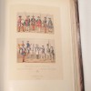 Legatura coeva in mezza pelle marrone e carta marmorizzata policroma, con punte; ai piatti, filetto impresso in oro ai bordi delle parti in pelle; dorso a cinque nervi rilevati, con autore, titolo e numero di tomo, decorato alle carte caselle con fregi floreali entro riquadro, il tutto in oro. Al I volume: (4) - XXVII - (1 bianca) - 196 - (36) pagine numerate, compresi occhietto e frontespizio, nonché, nel testo, XII tavole litografate a piena pagina in nero e ocra, impresse su sei fogli al recto e al verso, con immagini di capi di vestiario. Al II volume: 173 carte non numerate, compreso occhietto; 88 tavole fuori testo, relative agli antichi Egiziani, all'Antichità classica dalle origini fino alla caduta dell'Impero Romano, nonché alle civiltà di Oceania, Africa, America e Asia. Al III volume: 131 carte non numerate, compreso occhietto; 95 tavole fuori testo, relative al Giappone e ad altre zone dell'Estremo Oriente, all'India, ai paesi musulmani di Asia e Nord Africa, alla Turchia, alla civiltà bizantina e al Medioevo europeo. Al IV volume: 133 carte non numerate, compreso l'occhietto; 99 tavole fuori testo, relative all'Europa fra il Medieovo e la seconda metà del Cinquecento. Al V volume: 132 carte non numerate, compreso l'occhietto; 94 tavole fuori testo, relative all'Europa tra il tardo Cinquecento e la fine del Settecento, con particolare riguardo alla Francia. Al VI volume: 147 carte non numerate; 97 tavole fuori testo, rappresentanti costumi databili fra la fine del Settecento e il primo ottocento, nonché costumi popolari e storici dei Lapponi e di varie popolazioni europee. Testo in lingua francese. L'opera, in edizione originale, venne pubblicata nel 1888, oltre che nel formato in-folio, in quello in-4°. La raccolta è un monumentale e accurato studio sulla moda, l'arredamento, le armi e le arti decorative di tutte le civiltà nel corso della storia; Colas, così definisce l'opera: "C'est le plus important recueil général concernant le costume". La silloge è ricca di ben 500 tavole, di grande interesse iconografico, tratte da reperti archeologici, miniature, dipinti, sculture e altre fonti: fra esse, vi sono immagini 300 litografate a colori, con interventi in oro e argento, altre in nero e in camaïeu. Esemplare in eccellente stato conservativo; al IV tomo, interventi marginali con nastro adesivo a due carte. Cfr. COLAS R., "Bibliographie generale du costume et de la mode", Paris 1933, vol. II, num. 2472; "Lipperheideschen Kostumbibliothek [Katalog der]", Berlin 1965, vol. I, scheda Ad 52.