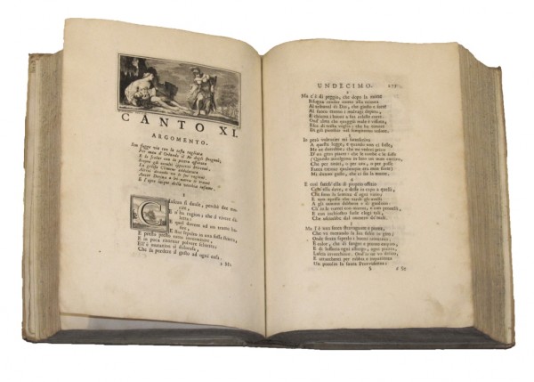 Legatura originale in piena pergamena; titolo in oro su tassello rosso e note manoscritte al dorso; tagli spruzzati. pp.XXXVI, 420; (2), 412. Titolo impresso in rosso e nero, con bella vignetta incisa da F.Zucchi dal disegno di G.Ghedini, note manoscritte; ritratto dell'autore inc. a piena pag. in antiporta, 18 graziosi finalini e 30 capilettera istoriati incisi da anonimo artista, 30 eleganti testate su 1/3 di pagina disegnate da G.Ghedini ed incise con maestria da F.Zucchi, Cattini, M.Pitteri, P.Monaco. Edizione originale e molto pregiata, pubblicata postuma. Esemplare in discrete condizioni, alcune stropicciature.