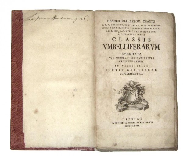 Legatura postuma in carta decorata d'epoca. 125 pagine numerate, VI tavole fuori testo pi� volte ripiegate in fine al volume e numerose testatine incise. Frontespizio con marca tipografica incisa e controfondato con carta di rinforzo, dedica entro cornice a carattere floreale. Rara ed interessante opera botanica dedicata alle Apiaceae (o Umbelliferae, nomen conservandum), famiglia di piante dicotiledoni che comprende circa 3000 specie suddivise in 420 generi presenti in tutte le zone temperate del mondo e caratterizzata da una infiorescenza tipica, l'ombrella. L'autore dell'opera, lussemburghese ma naturalizzato austriaco, fu un apprezzato medico e botanico. Le tavole incise spettano alla mano di Augustin Cipps sia per quanto riguarda il disegno che l'incisione. Esemplare in discrete condizioni, omogenee macchiette brunite lungo le pagine di testo.