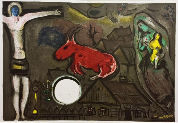 Litografia originale a sei colori impressa su carta vellina, firmata in lastra in basso a destra. Tavola tratta dal "Derriere Le Miroir" n° 27-28, celebre rivista ideata dall'editore A. Maeght. Chagall iniziò ad eseguire quadri della crocifissione dopo che i nazisti iniziarono l'Olocausto. Questa è una delle prime due litografie a colori che Chagall ha disegnato direttamente sulla pietra. La rivista accompagnò ogni esposizione della galleria Maeght dal 1946 al 1982 (complessivamente 253 numeri). I primi numeri di "Derrière le miroir" furono messi in vendita nelle edicole senza incontrare il gradimento del grande pubblico. Solo successivamente vennero apprezzate dalla critica, in particolar modo quando gli intenditori d'arte capirono l'importanza delle litografie contenute al loro interno. Gli stampatori della rivista cambiarono nel corso degli anni (fino al numero 115 le litografie furono stampate da Mourlot a Parigi), ma in ogni numero fino al 232 furono sempre inserite diverse litografie originali anche a doppia pagina, come in questo caso. L'inizio della produzione litografica di Chagall risale al periodo di Berlino (1922-1923) ma fu nel 1946, negli Stati Uniti, che Chagall accettò di illustrare "Le mille e una notte": le tredici tavole del volume segnarono i suoi primi passi nella litografia a colori. Di ritorno a Parigi nel 1950, l'artista si recò dallo stampatore Fernand Mourlot, al quale si deve in gran parte il rilancio della litografia nel dopoguerra. Dal 1950 al 1952 Chagall frequentò assiduamente l'atelier di Mourlot dove imparò tutti i segreti del mestiere. Le prove di quel periodo furono stampate in pochi esemplari o distrutte, poiché lo scopo dell'artista non era quello di realizzare opere finite ma di impadronirsi della tecnica. Tra il 1922 e il 1985 Marc Chagall realizzò 1500 litografie. Molte litografie di Chagall furono realizzate con venti / venticinque colori e testimoniano l'enorme lavoro dell'artista: nessuno prima di lui raggiunse una perfezione tale da associare all'ineguagliabile ispirazione la completa padronanza della tecnica. Chagall fece della litografia non un mezzo per moltiplicare le sue opere, ma uno strumento necessario a una creazione che non poteva essere espressa in alcun altro modo. L'artista non realizzò quasi mai bozzetti preliminari per le sue litografie e da ciò derivano l'incanto e la spontaneità creatrice dei suoi lavori. Esemplare in perfetto stato conservativo, margini e piega editoriali.