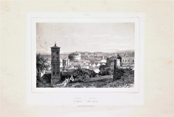 Stampa litografica originale eseguita alla matita; sotto la linea marginale inferiore a destra indicazione dello stampatore parigino Bernard Lemercier, a sinistra nome dell'autore ed al centro doppio titolo in francese e italiano. Il disegno, eseguito dal vero, e la trasposizione su lastra, spettano a A. V. Deroy, artista molto prolifico ed attivo nella seconda metà del XIX secolo, egli collaborò con il padre, Isidore Laurent, nell'illustrazione di libri di viaggi. Con la litografia, tecnica usata con grande abilità da Deroy, si ottiene un piacevole effetto di morbidezza, simile ad un disegno a matita. Esemplare in buono stato conservativo.
