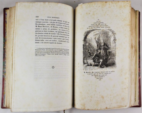 Red half calf with the original marbled paperbacks inside. Author and title impressed in gilt on the spines; ex libris “Josephi Andreae De Robillard De Beaurepaire Rothomagensis”. Vol. I: portrait of the author, 372 - 92 numbered pages (an exchange of letters between the author and M. C. Leber on the origin of the Danse Macabre), 6 plates of numbered engravings and 1 unnumbered folded. Vol. II: full-page vignette before the title page, 220 numbered pages and 43 plates of numbered engravings, some of which are folded several times. A remarkable essay on the subject, defined by bibliographies as one of the most complete and well-known treatises. Langlois was a famous painter French, defined by scholars as the “Norman Callot”. Copy in good condition, slight foxing.