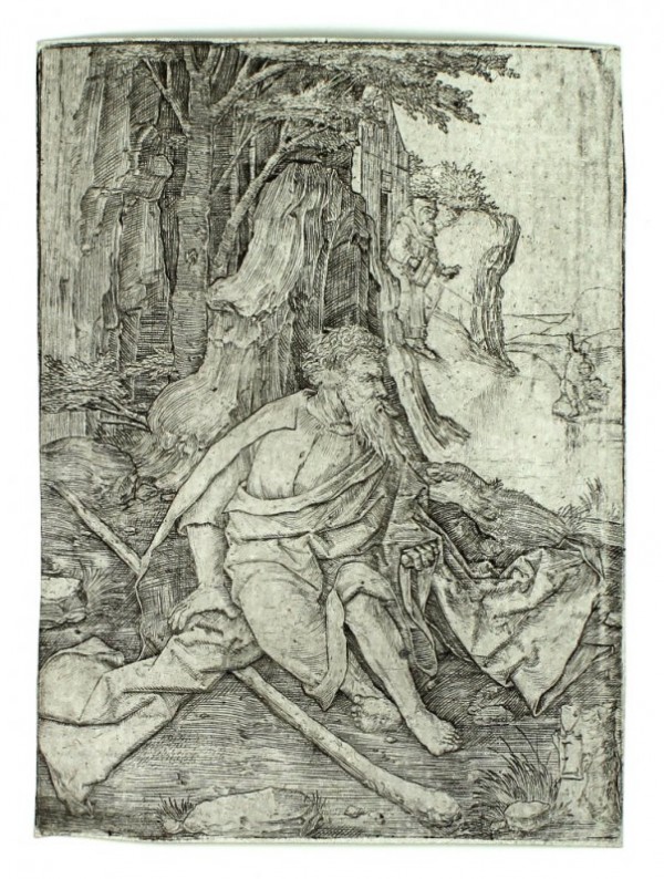 Incisione originale al bulino in unico stato e nella variante "c" su "c", impressa su carta vergata senza filigrana, databile alla fine del XVI secolo. In basso a destra monogramma "L" su una piccola edicola inchiodata su un ceppo d'albero. L'immagine raffigura San Cristoforo, martire della Chiesa non più annoverato tra i santi del calendario cattolico per l'incerta storicità. Come citato nella "Leggenda Aurea", Crisotoforo era un cananeo desideroso di mettersi al servizio dell'uono più potente del suo tempo, dopo un re che si ritrovò a tremare davanti all'apparizione del domonio, servì quest'utlimo, ma quando lo vide tremare davanti alla croce di Cristo lo abbandonò. Da allora seguì Cristo traghettando poveri e derelitti attraverso il fiume. Una notte traghettò Cristo stesso sotto le sembianze di un bambino, durante il tragitto il peso si fece via via maggiore e quando Cristo si rivelò gli disse che aveva trasportato il peso di tutto il mondo. E' forse la prima stampa eseguita da Luca da Leida, quando aveva solo 12 anni, nonostante qualche ingenuità traspare già chiaramente tutta la sua promettente abilità. Conosciuto anche come Lucas Hugensz o Jacobsz, era un incisore e pittore olandese, nato e attivo prevalentemente a Leiden. Fu tra i principali pittori e incisori del suo tempo. Dürer rimane il suo punto di riferimento principale, i due si incontrarono durante un soggiorno di Dürer nei Paesi Bassi e in molti affermano che scambiarono le proprie stampe l'un con l'altro in segno di amicizia e apprezzamento, ma Lucas da Leyden era meno colto e pensatore di Dürer, ed ebbe la tendenza a concentrarsi su caratteristiche aneddotiche dei soggetti e a trovare piacere nelle caricature degli stessi; tuttavia, Lucas ha lasciato un corpus di opere estremamente ricco, nonostante la morte prematura, ed è stato sicuramente un artista prodigioso. L'esemplare si presenta in buono stato di conservazione, con margine sottilissimo praticamnete sempre presente; inchiostratura piuttosto debole.
