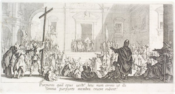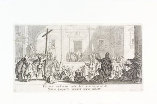 Incisione originale eseguita all'acquaforte e a bulino su matrice di rame. In lastra, in basso a sinistra, firma incisa dell'autore. L'opera è la quinta tavola di una suite di soggetto religioso, eseguita dal grande incisore lorenese Callot su propria invenzione. La serie è conosciuta come La Grande Passion, per distinguerla dall'altra raccolta sullo stesso tema, composta da 12 fogli e detta La Petite Passion. L'artista lavorò alla silloge nel secondo decennio del Seicento, durante il periodo trascorso alla corte granducale di Firenze, prima del ritorno a Nancy avvenuto nel 1621. La Grande Passion rimase incompiuta alla settima tavola, conosciuta dai collezionisti come Le Crucifiement. Sullo sfondo della tavola in esame, nell'iquadratura di una porta è raffigurato Gesù circondato dai soldati nel momento in cui è presentato al popolo. In primo piano, a sinistra, un uomo regge la croce sotto la quale è incisa la firma dell'artista, al bordo di uno scalino. Esemplare in buono stato conservativo lievissime mancanze agli angoli. I stato su III.