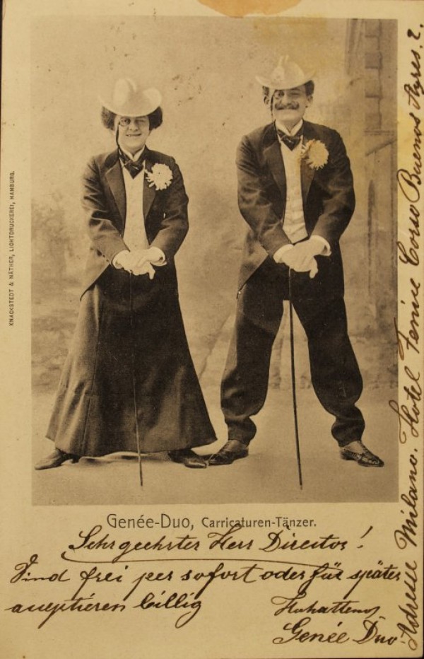 Cartolina postale , autografa firmata , del Duo - Genee. Coppia di ballerin di Avanspettacolo, i attivi in Germania alla fine del XIX secolo e inizio del XX . La cartolina è indirizzata al Direttore del teatro Alfieri di Torino.