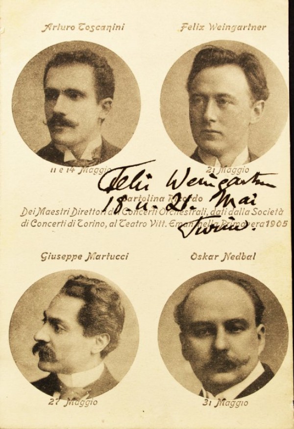 Cartolina postale autografa firmata. Cartolina ricordo dei Maestri Direttori di Concerti orchestrali dati dalla Società di Concerti di Torino, al teatro Vittorio Emanuele nella primavera del 1905. Arturo Toscanini, concerto del 11e14 maggio, Giuseppe Martucci concerto del 27 maggio , Oskar Nedbal ceoncerto del 31 maggio. Ed infine Felix Weingartner  (  direttore d'orchestra austriaco ), concerto del 21 maggio, egli ha  autografato e datato la cartolina .Esemplare in buone condizioni conservative.