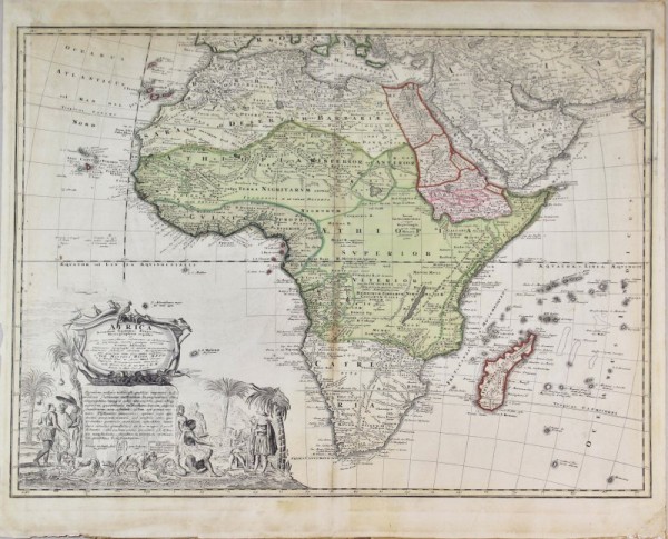 Incisione originale eseguita all'acquaforte su matrice di rame, acquerellatura policroma coeva,all'angolo superiore sinistro ,titolo, più in basso scala metrica . La mappa geografica spetta a J. M. Haas , geografo e professore di matematica a Wittenberg, attivo nella celebre officina tipografica degli Homann , celebre dinastia di incisori e stampatori che, nel corso del Settecento, pubblicarono numerosi atlanti geografici, diffusi in tutta Europa. La tavola in esame rappresenta il continente Africano, Haas si è basato sulle cartografie precedenti a cui ha aggiunto ulteriori informazioni raccolte da lavoro di cartografi francesi Delisle e D'Anville. Molto caratteristico il cartiglio della mappa composto da alcuni europei e africani che interagiscono con leoni ed altri animali indigeni , questa scena esprime la volontà di cooperazione e comprensione. Nella parte superiore sono raffigurati porzioni dell' Asia , della Grecia , dell'Italia e della Spagna.Esemplare in buone condizioni conservative.