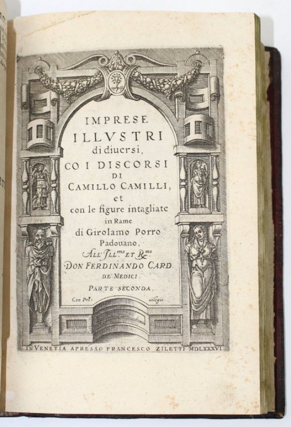 Elegante legatura coeva di produzione italiana in pieno marocchino rosso con, ai piatti, filetti a secco, duplice filetto con angolari in oro; al centro dei piatti, stemma gentilizio sormontato da corona reale, in oro; dorso accuratamente rifatto, con 4 nervi rilevato e filetti in oro. 8 pagine non numerate, compreso elegante frontespizio figurato a carattere di edicola architettonica con due note di possesso manoscritte: una, datata 1610, del collegio gesuitico di Ledesma; l'altra, Hospital di Rhetorica August 1790; seguono 182 pagine numerate, (mancanza della carta bianca finale); Parte Seconda: 95-(1) pagine numerate, compreso il frontespizio con titolo entro edicola architettonica; Parte Terza: 56 pagine numerate, compreso frontespizio con titolo entro edicola architettonica. All'interno, 108 incisioni di emblemi dalle misure di ca. mm 65x65, incise da Giacomo Porro, illustre incisore del suo tempo. Prima edizione di questa raffinata opera in cui l'autore illustra lo stretto rapporto tra le virtù proprie delle casate a cui l'impresa si riferisce e il contenuto artistico espresso dall'illustrazione, come lui stesso definisce quale "imagine de' pensieri, ritraendo una sola un pensier solo virtuoso". Camillo Camilli, fu un celebre letterato di probabili origini senesi, reso famoso, oltre che dall'opera in esame, soprattutto dai Cinque Canti di Camillo Camilli aggiunti al Goffredo del signor Torquato Tasso, pubblicata nel 1583. Esemplare dall'elegante legatura alle armi, oltre che al dorso abilmente rifatto, alcune spellature e piccoli rifacimenti ai piatti in particolare agli angoli; interno in buone condizioni, lievi arrossature ad alcune carte.