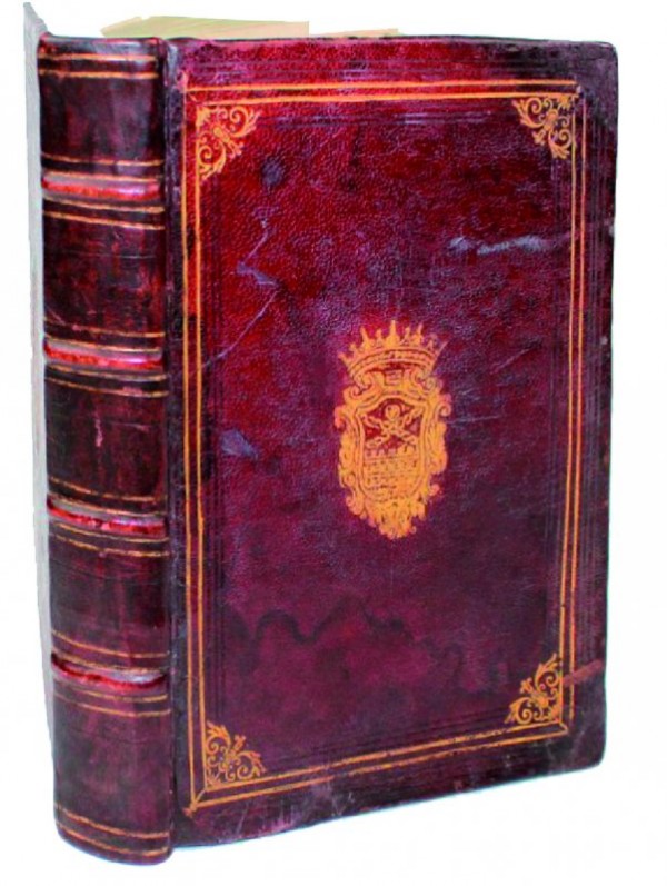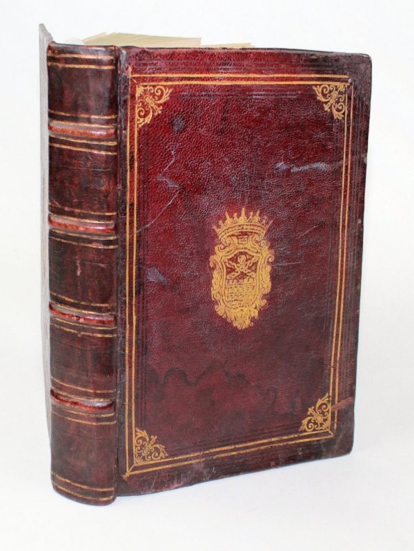Contemporary full red morocco with dry gilt fillets on covers; in the centre of the covers, coat of arms in gilt; carefully rebacked spine. 8 unnumbered leaves, including an elegant illustrated title-page in the form of an architectural aedicule with two handwritten notes of ownership: one, dated 1610, of the Jesuit college of Ledesma; the other, Hospital di Rhetorica August 1790; this is followed by 182 pp.num., (lack of final blank leaf) - 95-(1)- 56 numbered pages. Inside, 108 engravings of emblems engraved by Giacomo Porro, an illustrious engraver of his time. First edition of this refined work. Copy in good condition, in addition to the rebacked spine, some peeling on the covers, especially at the corners; clean interior, slight redness to some leaves.