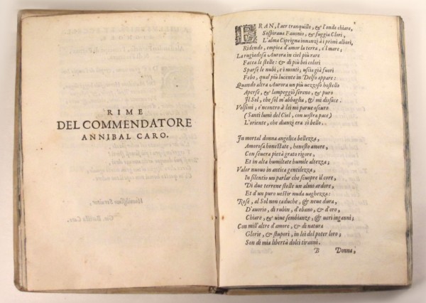 Legatura sei-settecentesca in piena pergamena rigida; dorso liscio recante in testa autore e titolo in oro, su fondo rosa. Tagli verde-azzurri. (8)-103- (1 bianca) - (8) pagine numerate, compreso il frontespizio con marca tipografica silografata. Testo volgare in carattere tondo per la lettera dedicatoria, corsivo per le rime; capilettera abitati e decorati a racemi, nonch� altri fregi tipografici, il tutto a silografia. L'opera, di notevole eleganza tipografica, � una ristampa delle poesie liriche di A. Caro, impresse per la prima volta, postume, a Venezia per i tipi di Aldo nel 1569. L'autore, celebre per la sua traduzione volgare dell'Eneide, fu un letterato rappresentativo dell'et� del Manierismo e segu� i modi del Petrarchismo. Nella silloge, come risulta anche dell'indice finale, sono comprese poesie in forma di sonetto, canzone, ottava, madrigale ed egloga in endecasillabi sciolti. Alcuni sonetti spettano ad altri importanti autori coevi quali Angelo di Costanzo, Benedetto Varchi e Battista Guarini, e recano le risposte in versi di Caro. Esemplare in buono stato conservativo; usura all'angolo in basso del piatto inferiore della legatura.