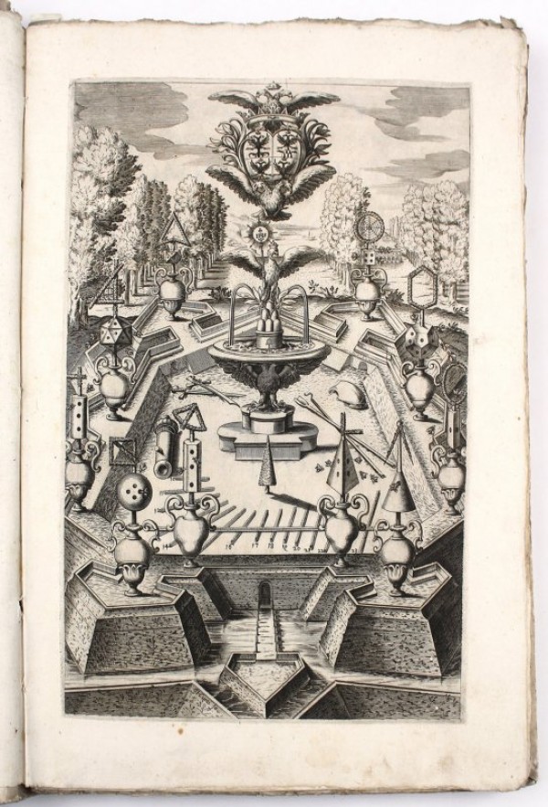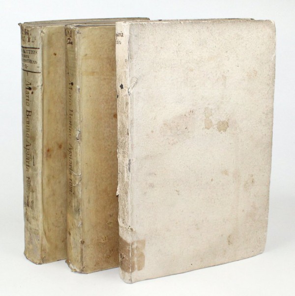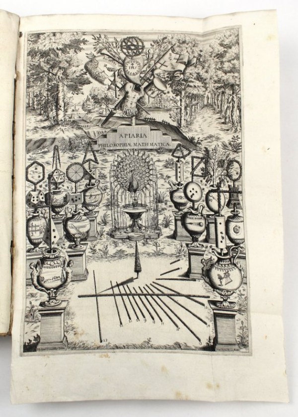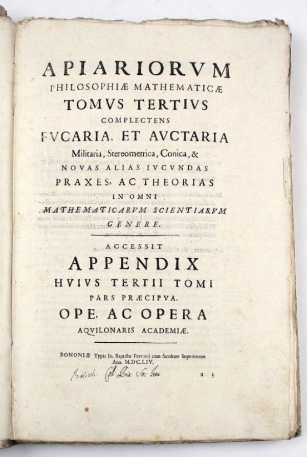 Vols I-II: contemporary vellum, manuscript titles along spines (covers bowed, spines a little torn). Vol. III: contemporary pasteboard with manuscript title, uncut (lightly soiled). Pagination of vols I-II as in Riccardi. Vol. III: [34], 199[1], [20], 54pp. Engraved frontispieces, folding in vols I-II, engraved equestrian portrait of Ferdinand III, engraved and woodcut illustrations. Halftitle in vol. III. This magnificent publication is rarely found complete. It covers many aspects of mathematics, physics, catoptrics, dioptrics, dialling, surveying and includes descriptions of many machines including a machine of perpetual motion. The second volume has a section on music and acoustics. Occasional soiling, half-title stained, holes on O3-O4 of vol. III, a few quires near