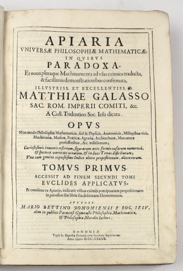 Vols I-II: contemporary vellum, manuscript titles along spines (covers bowed, spines a little torn). Vol. III: contemporary pasteboard with manuscript title, uncut (lightly soiled). Pagination of vols I-II as in Riccardi. Vol. III: [34], 199[1], [20], 54pp. Engraved frontispieces, folding in vols I-II, engraved equestrian portrait of Ferdinand III, engraved and woodcut illustrations. Halftitle in vol. III. This magnificent publication is rarely found complete. It covers many aspects of mathematics, physics, catoptrics, dioptrics, dialling, surveying and includes descriptions of many machines including a machine of perpetual motion. The second volume has a section on music and acoustics. Occasional soiling, half-title stained, holes on O3-O4 of vol. III, a few quires near