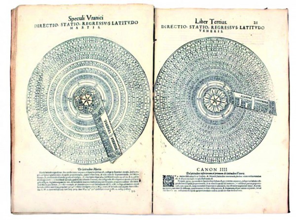 Back and sides made from a XIV century vellum music sheet. 4 leaves unnumbered, including the magnificent illustrated title-page in late Mannerist style, engraved by Giacomo Franco; traces of signatures of possession, discolored; in the lower margin, a handwritten note “Ex dono Bartholomei Perricelli”, a Jesuit benefactor of the seventeenth century; this is followed by 42 leaves numbered and 1 cb. Inside, 17 large engraved circular diagrams, 16 of which are with volvelles, with a total of 36 moving parts (out of 39 that should be). Missing the folded “Canon Sexagenarius” that should have been tied to the bottom of the volume. 8 pages with the smallest format, In-4° entitled “De harum paginarum usu” are missing, in almost all of the copies as a natural consequence of the instructions given by the author himself to the binder: 'Haec pars in libro non ligetur'. The motions of the eight spheres and the seven planets are studied, as well as the rules for constructing the twelve celestial houses according to the methods of Regiomontanus and Alcabitius. First rare edition. Copy in good condition, clean and with full margins; small tear at the lower edge of the A4 leaf, closed by restoration, ink stains on the K2 and K3 leaves.