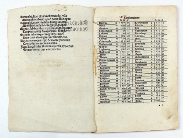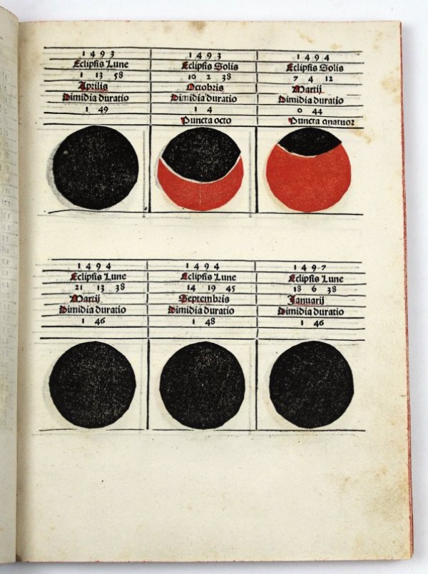 Disbound, modern cloth chemise and case. 30 leaves, printed in red and black, 4 full -page woodcuts illustrating instruments at the end, one with 1 volvelle (of two), 12 woodcuts zodiac symbols, woodcut white-on-black initials, red capital strokes. Seventh edition, first published in 1474. One of his most famous works, the Kalendarium was an innovative calendar that predicted solar and lunar eclipses and calculated the day of the year in which, from 1477 to 1531, Easter would fall. In fact, the text was an updated compendium of the astronomic and mathematical knowledge of the time, and had an openly practical and teaching purpose. Lacking the second volvelle and string pointer, metal pointer missing from final woodcut. Top and bottom margin of title a little creased, a3-7 detached, woodcuts of instruments lightly soiled, light marginal thumb-soiling.