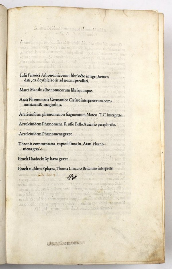 Firmicus Maternus, Julius (fl. early 4th century AD). Matheseos (De nativitatibus libri viii). Edito da  Franciscus Niger. Unito a:  Marcus Manilius (fl. 1st century AD). Astronomicorum libri V . Unito a : Aratus (ca. 315 BC - 240 BC). Phaenomena (Latin and Greek). Tradotto da Germanicus Caesar, Marcus Tullius Cicero, Rufius Festus Avienus. Unito a:  pseudo -Theon. Commentaria in Aratum (Greek). Unito a:  pseudo-Proclus Diadochus (i.e. Geminos). Sphaera (Greek and Latin). Tradotto da  Thomas Linacre (1460-1524).