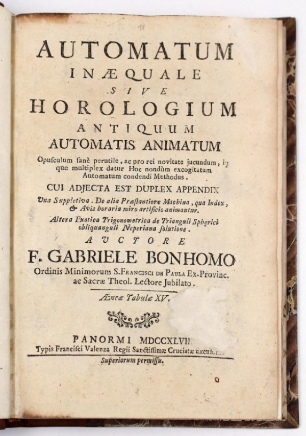 Legatura novecentesca in mezza pelle e carta decorata; titolo e fregi in oro e a secco al dorso. Guardie settecentesche di recupero con note manoscritte avulse dal volume. 8 pagine non numerate, compreso il frontespizio con titolo e una integrazione di qualche centimetro in basso a destra, probabilmente in luogo di un timbro ritagliato; 122 pagine numerate; 15 tavole fuori testo incise e più volte ripiegate. Rara prima edizione originale della descrizione di un orologio meccanico, costruito dall'autore stesso. Cfr. Treccani, "L'orologio progettato dal B. - di cui egli, con l'aiuto dell'artigiano palermitano Domenico Vella, costruì un esemplare che donò al suo convento - presentava la linea delle ore non circolare ma ondulata, e le lancette di lunghezza variabile, per seguire tale linea. La variazione della lunghezza doveva essere effettuata a mano. Per ovviare all'imperfezione, il B. escogitò anche un meccanismo che avrebbe compiuto automaticamente tale operazione, descrivendolo in una appendice aggiunta all'opera. Ma tale meccanismo, ovviamente, era regolato su un particolare corso astronomico, il che ne restringeva l'uso a certe aree geografiche. Per tanto con esso l'orologio perdeva nella generalità d'uso quanto acquistava in comodità. Lo sviluppo successivo dell'orologeria ha mostrato che il presupposto della persistente attualità per gli usi civili dell'antico sistema di misurazione del tempo, su cui il B. fondava la propria opera, era sostanzialmente antistorico. Questa considerazione tuttavia non intacca il preciso interesse tecnico di molte analisi del libro". Baillie pp. 215 - 217: «The author, evidently a competent mathematician, devised a means of arranging a clock to show the unequel hours, or the hours formed by deviding the times between sunrise and sunset, and between sunset and sunrise, each into 12 parts... Unequal hours were used... till quite a late date, and two clocks in the Nürnberg Museum had dials divided to show them. Bonhomo's device is far better than that of either of these clocks». Esemplare, salvo che per l'integrazione al frontespizio e la legatura non coeva, in ottimo stato di conservazione.