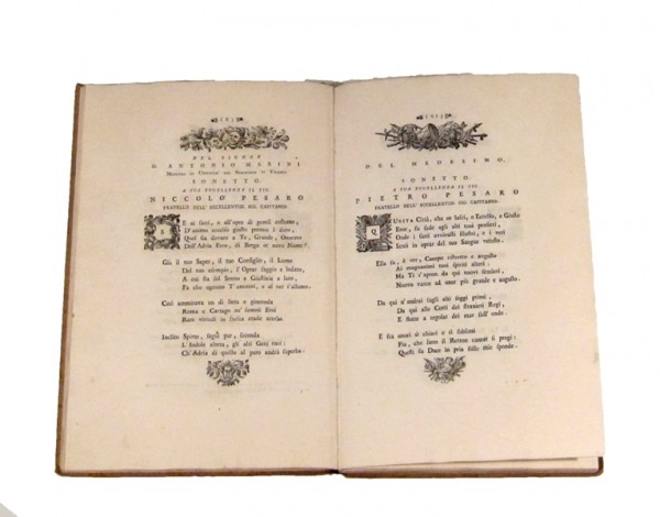 Legatura ottocentesca in carta rigida, decorata policroma, ampio cartiglio muto, incollato al piatto superiore, a contenere possibili indicazioni da manoscriversi; 92 pagine mal numerate LXXXVIII (alcune doppie numerazioni), compreso il frontespizio con bella marca tipografica araldica; ogni pagina decorata con capilettera istoriati, testatine e fregi incisi, al fine, deliziosa vignetta di chiusura incisa all'acquaforte. L'opera, è una serie di componimenti poetici celebrativi della partenza dalla Prefettura di Vicenza del nobile Giovanni Pesaro. Esemplare in eccellente stato conservativo, molto fresco all'interno.