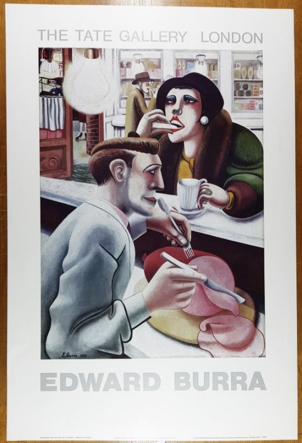 Burra presso la Tate Gallery di Londra nel 1985. Burra è  celebre per le sue raffigurazioni del degrado sociale e della  cultura di colore . Burra nacque a South Kensington,  ebbe la sua prima galleria personale nel 1929, fece molti viaggi e di conseguenza molti stili confluiscono nei suoi lavori, prevalentemente realizzati con acquerelli dai colori molto forti. Nell'immagine esiste una strana  tensione  tra il barista e la cliente, la donna mangia distrattamente, mentre l'uomo affetta il prosciutto con grande soddisfazione e guardandola di traverso.  Burra era un acuto osservatore del quotidiano, spesso esagerandolo in caricatura per poter commentare la società.Esemplare in buone condizioni conservative.