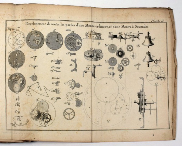 Legatura coeva in piena pelle bazzana con titolo breve in oro su tassello rosso e ricchi fregi in oro al dorso; guardie marmorizzate; tagli rossi. Al contropiatto anteriore, ex-libris di Augustin Seguis. 1 carta bianca; occhietto; frontespizio; XXIV-93-(94 bianca)-(2)- 306-da XXV a XXVIII-da 307 a 308-XXXV (per Tables du Tems Moyen) pagine numerate. XVII tavole numerate incise fuori testo sulla sola parte esterna e ripiegate; 1 carta bianca finale. Esemplare completo di tutte le pagine, delle tavole e delle carte bianche, iniziale e finale; alcune pagine del testo posposte. Prima edizione dell'opera principale di Jean-André Lepaute, considerato ai suoi tempi come il più abile orologiaio di Parigi, il quale fabbricò un gran numero di orologi che adornano gli edifici pubblici parigini e che inventò meccanismi del tutto nuovi per il tempo. Il trattato è suddiviso in due parti; la prima contiene, principalmente, la descrizione di un Pendolo a secondi e di un orologio ordinario, pone il loro confronto, il modo di conoscerli e di regolarli mediante il Sole e le Stelle fisse: (pp. 1 a 93) «qui contient principalement la description d'une Pendules à secondes, et d'une montre ordinaire, leur comparaison, la manière de les connoître, de les finir et de les régler par le moyen du Soleil et des Etoiles fixes ». La seconda parte è dedicata alla descrizione di diversi orologi a pendolo con suoneria, a ripetizione e di meccanismi vari: (pp. 95 a 308) «qui comprend la description de plusieurs Pendules à sonnerie, à répétition, à une roue, à équation ; l'horloge horizontale, les remontoirs, le réveil, etc. L'histoire critique des meilleurs échapemens connus jusqu'aujourd'hui, une explication détaillée des avantages et de la construction de mon nouvel échapement ; un traité des engrenages et du mouvement d'oscillation, des tables d'équation, une table des longueurs du pendule comparées avec la durée des oscillations, etc. ». Belle e interessanti le 17 tavole illustrative. Esemplare in discreto stato conservativo, sciupature alla legatura, in particolare alle cerniere che si presentano fessurate e con piccole mancanze del pellame; antico restauro al dorso con piccole lacune e incollature; sporadiche fioriture o ingiallimenti; le tavole finali leggermente stropicciate al bordo esterno.