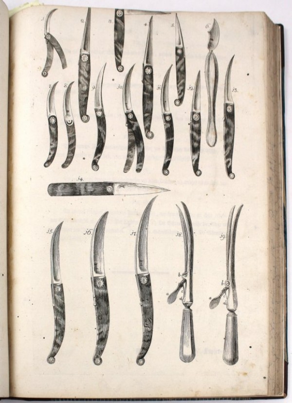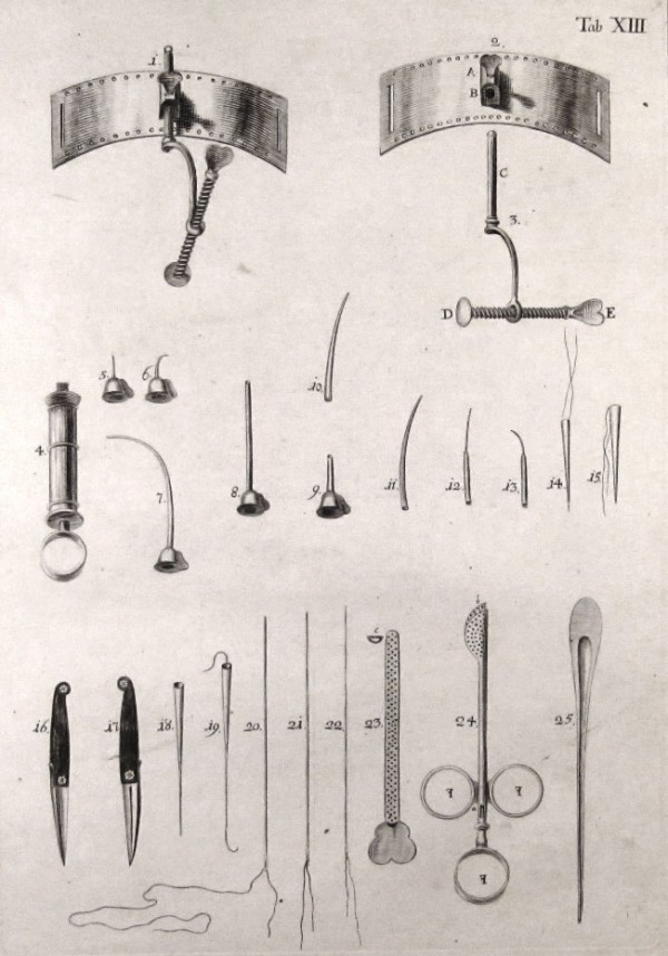 Incisione originale su rame eseguita all'acquaforte, raffigurante ferri chirurgici di foggia settecentesca. Tavola tratta da una delle più famose e rare opere sulla strumentazione chirurgica eseguita per opera di questo valente e celebrato accademico. Giovanni Alessandro Brambilla, chirurgo militare dell'esercito austriaco, fondò la biblioteca universitaria pavese e si adoperò a diffondere la cultura italiana in Austria. Esemplare in buone condizioni conservative.