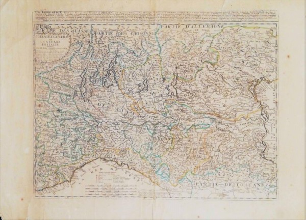 Incisione originale eseguita all'acquaforte su matrice di rame, senza testo al verso; alcuni interventi ad acquerello in più colori, in corrispondenza con i confini politico-amministrativi dei territori raffigurati. In lastra, sopra il lato superiore della cornice graduata, titolo; altra versione del titolo entro la parte figurata, in alto a sinistra entro cartiglio con dati di tipografia; sempre entro la parte figurata, in basso, spiegazione dei simboli, quattro scale metriche e privilegio del re di Francia. La carta geografica spetta a J. B. Nolin iunior, geografo del re di Francia come il padre omonimo. Come precisa Barrera, il foglio è una "riedizione di I. B. Nolin di carta edita da Lotter nel 1730 con titolo principale in latino". Esemplare in ottimo stato conservativo, dagli ampi margini.