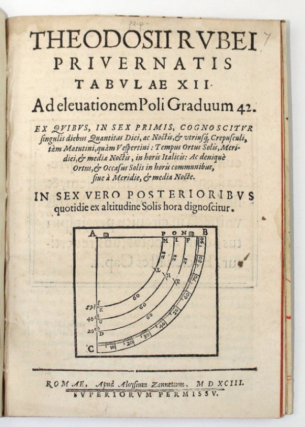 THEODOSII RUBEI PRIVERNATIS TABULAE XII AD ELEVATIONEM POLI GRADUUM 42. EX QUIBUS, IN SEX PRIMIS, COGNOSCITUR SINGULIS DIEBUS QUANTITAS DIEI, AC NOCTIS, ET UTRIUSQUE CREPUSCULI, TAM MATUTINI, QUAM VESPERTINI: TEMPUS ORUS SOLIS, MERIDIEI, ET MEDIAE NOCTIS, IN HORIS ITALICIS: AC DENIQUE ORTUS, ET OCCASUS SOLIS IN HORIS COMMUNIBUS, SIVE A MERIDIE, ET MEDIA NOCTE. IN SEX VERO POSTERIORIBUSQUOTIDIE EX ALTITUDINE SOLIS HORA DIGNOSCITUR.