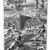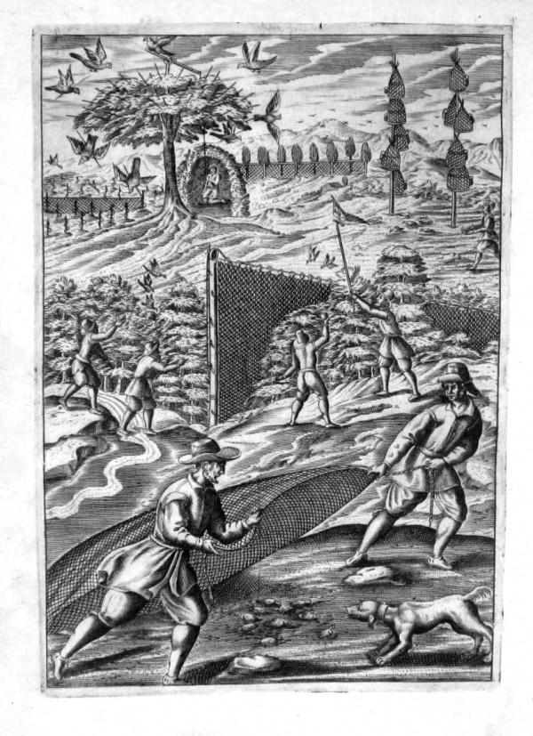 Incisione originale a bulino di rame. La trasposizione su lastra, eseguita con abile tratteggio spetta, secondo il repertorio di Piantanida-Diotallevi-Livraghi, all'incisore N. Pierry. Tavola tratta da un importante e raro trattato di E. Raimondi da Brescia sui vari metodi di caccia e pesca, l'accurata raffigurazione delle tecniche venatorie, ambientate entro dettagliati paesaggi; la descrizione spazia dali animali utilizzati dai cacciatori, quali cavalli, "uccelli di rapina" e cani, agli animali cacciati, sia mansueti che feroci. L' immagine raffigurata, di gusto tardo manierista, è di notevole interesse documentario. Esemplare in buone condizioni conservative.
