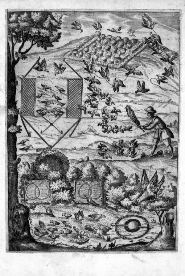 Incisione originale a bulino di rame. La trasposizione su lastra, eseguita con abile tratteggio spetta, secondo il repertorio di Piantanida-Diotallevi-Livraghi, all'incisore N. Pierry. Tavola tratta da un importante e raro trattato di E. Raimondi da Brescia sui vari metodi di caccia e pesca, l'accurata raffigurazione delle tecniche venatorie, ambientate entro dettagliati paesaggi; la descrizione spazia dali animali utilizzati dai cacciatori, quali cavalli, "uccelli di rapina" e cani, agli animali cacciati, sia mansueti che feroci. L' immagine raffigurata, di gusto tardo manierista, è di notevole interesse documentario. Esemplare in buone condizioni conservative.