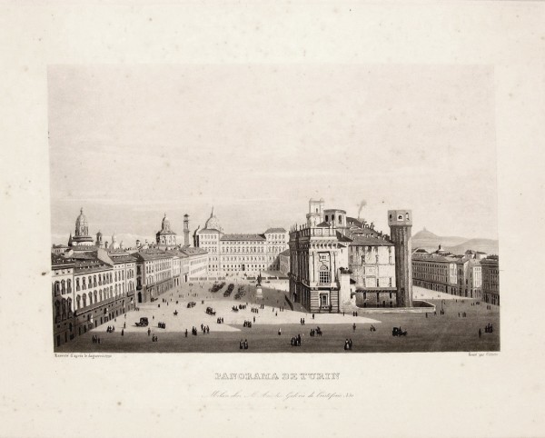 Incisione originale eseguita all'acquatinta su matrice di acciaio; in lastra, sotto la parte figurata, a sinistra indicazione "executé d'aprés un daquerréotype"; a destra, indicazione dell'incisore, al centro titolo e indirizzo dello stampatore, a destra scritta antica. Veduta di Piazza Castello in Torino, l'immagine si apprezza per l'ampio taglio orizzontale di notevole effetto scenografico e per l'accurata esecuzione. La piazza è dominata da Palazzo Madama, sullo sfondo a sinistra il Palazzo Reale, la Cupola del Guarini , dove è custodita la Sindone e a destra, in lontananza, la Basilica di Superga; la piazza è disseminata di piccole figure umane e carrozze. Citterio, specializzato in incisioni vedutistiche, operò su disegno di grandi artisti come Carlo Bossoli. L'opera in esame riprende come modello un dagherrotipo, un'immagine ottenuta con il procedimento fotografico della dagherrotipia, inventato nel 1839 da Daguerre in collaborazione con Niepce. All' epoca di Guglielmo VII del Monferrato, al centro di piazza Castello sorgeva un fortilizio chiamato Castrum Portae Phibellone, di cui possiamo ancora oggi ammirare le due torri sul lato orientale . Il Castello subì molteplici trasformazioni nel tempo, nel XV secolo ampliarono le costruzioni difensive, Carlo Emanuele II mutò completamente la disposizione dell'edificio e fece costruire il grande salone, infine nel 1718, Iuvarra eresse la facciata di ponente ed il grandioso scalone a due rami , fu in ultimo dimora della vedova di Carlo Emanuele II. Esemplare in buone condizioni conservative.
