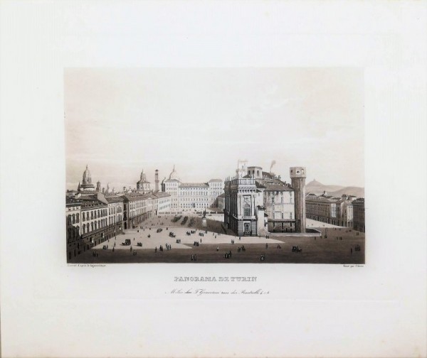 Incisione originale eseguita all'acquatinta su matrice di acciaio; in lastra, sotto la parte figurata, a sinistra indicazione "executé d'aprés un daquerréotype"; a destra, indicazione dell'incisore, al centro titolo e indirizzo dello stampatore, a destra scritta antica. Veduta di Piazza Castello in Torino, l'immagine si apprezza per l'ampio taglio orizzontale di notevole effetto scenografico e per l'accurata esecuzione. La piazza è dominata da Palazzo Madama, sullo sfondo a sinistra il Palazzo Reale, la Cupola del Guarini , dove è custodita la Sindone e a destra, in lontananza, la Basilica di Superga; la piazza è disseminata di piccole figure umane e carrozze. Citterio, specializzato in incisioni vedutistiche, operò su disegno di grandi artisti come Carlo Bossoli. L'opera in esame riprende come modello un dagherrotipo, un'immagine ottenuta con il procedimento fotografico della dagherrotipia, inventato nel 1839 da Daguerre in collaborazione con Niepce. All' epoca di Guglielmo VII del Monferrato, al centro di piazza Castello sorgeva un fortilizio chiamato Castrum Portae Phibellone, di cui possiamo ancora oggi ammirare le due torri sul lato orientale . Il Castello subì molteplici trasformazioni nel tempo, nel XV secolo ampliarono le costruzioni difensive, Carlo Emanuele II mutò completamente la disposizione dell'edificio e fece costruire il grande salone, infine nel 1718, Iuvarra eresse la facciata di ponente ed il grandioso scalone a due rami , fu in ultimo dimora della vedova di Carlo Emanuele II. Esemplare in buone condizioni conservative.