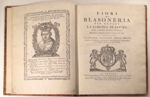 Legatura coeva in mezza pelle verde e carta marmorizzata, con punte; dorso liscio, decorato con fregi trasversali di duplice filetto, recante titoli, il tutto impresso in oro; tagli spruzzati d'azzurro. Per i Fiori di blasoneria: (8) - 73 - (3) pagine numerate; per la Relazione [...]: (16) - 82 pagine numerate, compresi occhietto e frontespizio; per Dell'istoria del Piemonte di Ludovico della Chiesa: (22) - 232 pagine numerate, compresi occhietto e frontespizio. Testo in lingua italiana. Al verso dell'occhietto dei Fiori di blasoneria e della Relazione (nonchè in testa all'introduzione del medesimo testo) ritratto silografato di F. A. Della Chiesa; ai 3 frontespizi, arma sabauda; capilettera decorati con paesaggi e altri fregi tipografici. Il volume comprende una pregevole ristampa settecentesca delle prime edizioni di due opere dovute a F. A. Della Chiesa, storiografo piemontese e vescovo di Saluzzo, più una reimpressione di Dell'istoria di Piemonte di L. Della Chiesa. L'opuscolo Fiori di blasoneria fu composto dal vescovo di Saluzzo come appendice alla sua opera Corona reale di Savoia; il testo, impresso seguendo l'edizione stampata a Torino nel 1655 (per i tipi di A. F. Cavaleri) è di notevole interesse araldico: comprende, infatti, la descrizione verbale delle armi di numerosissime località, nonchè di famiglie gentilizie piemontesi e transalpine, tutte legate (a vario titolo) alla casa regnante sabauda; la Relazione che segue, dello stesso autore, ripropone il testo dell'edizione di G. Zavatta e G. D. Gaiardo del 1635, mentre Dell'Istoria di Piemonte è una reimpressione dell'edizione originale pubblicata nel 1608, a Torino, per i tipi di A. Disserolio. Esemplare in ottimo stato conservativo; interno fresco, salvo contenuta ossidazione a poche pagine.