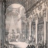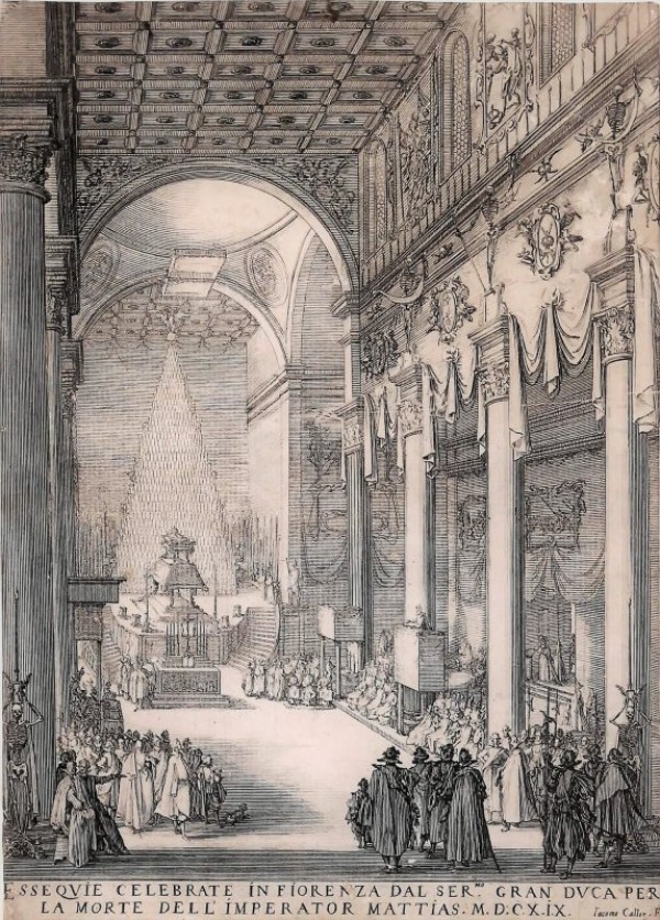 Incisione originale finemente eseguita all'acquaforte e a bulino su matrice di rame, nel secondo o terzo stato su tre. Sotto la figurazione, titolo e (in basso a destra) indicazione dell'autore. L'immagine documenta l'attività del grande incisore lorenese a Firenze, presso la corte dei Medici. La tavola rappresenta un momento della cerimonia funebre fatta celebrare dal granduca di Toscana in suffragio dell'imperatore Mattia d'Asburgo (morto il 20 marzo 1619). L'ufficio si svolge nella chiesa fiorentina di San Lorenzo (chiesa che, fra l'altro, era sede di molte cerimonie del genere e che ospita tuttora i mausolei dei Medici). Il catafalco dell'imperatore è posto su un piano elevato, dietro l'altar maggiore; l'abside è occupato da una monumentale piramide (simbolo d'eternità) illuminata da candele, in cima alla quale una statua della Fama suona la tromba. Le navate della chiesa sono parate con drappi nonché con rilievi, quadri e statue raffiguranti scheletri, emblemi ed episodi storici (forse relativi alla vita di Mattia). Il momento raffigurato nell'incisione è particolarmente significativo: il predicatore, sul pulpito, sta infatti pronunciando l'orazione funebre, di fronte al baldacchino sotto il quale siede il granduca e alla presenza di altri ascoltatori. Esemplare in discreto stato conservativo, rifilato ai margini, interamente controfondato per restauri; tracce di piega orizzontale al centro.