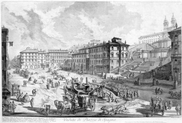 Incisione originale eseguita all'acquaforte su matrice di rame, nel V stato su otto secondo Hind. Filigrana: "giglio entro doppio cerchio". In lastra sotto la parte figurata, al centro titolo, a destra indicazione dell'autore e indirizzo dello stesso presso Palazzo Tomatis in qualità di stampatore. L'opera è una bellissima tavola appartenente alla serie delle grandiose Vedute di Roma, cui Piranesi attese dal 1748 fino agli ultimi anni: in queste tavole il maestro, che è ricordato come uno fra i massimi incisori del Settecento, intese celebrare la magnificenza della Città Eterna, sede degli antichi imperatori e dei papi. Il foglio fu eseguito per l'impressione nel primo stato nel 1750, secondo Hind. L'immagine è un grandioso scorcio di Piazza di Spagna, con al centro la fontana barocca detta, per la forma caratteristica a nave, la "Barcaccia" e con a destra la scenografica scalinata di Trinità dei Monti. Lo spazio urbano è animato da figure in abiti settecenteschi, a piedi e in carrozza. Secondo Hind, il quinto stato in esame è caratterizzato dall'indirizzo dell'autore come il quarto stato, ma rispetto ad esso non reca più l'indicazione del prezzo. Esemplare in buono stato conservativo, in carta spessa, dalla bella inchiostratura, fresco e a pieni margini; tracce di piegatura verticale al centro, forellini all'estremità del margine sinistro, probabilmente derivanti dall'inserimento originario del volume entro album.