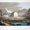 Stampa litografica originale finemente colorata all' acquerello d' epoca. Tavola eseguita da Armand Cuvillier, litografo svizzero attivo nel XIX secolo. Lungo il margine inferiore titolo, note tipografiche ed indicazione dell' autore. Veduta prospettica dell'Ospizio del Gran San Bernardo e del lago antistante, ripresa dal versante italiano. In primo piano gruppo di personaggi che percorrono a piedi ed a cavallo il sentiero che conduce all'ospizio. Esemplare in buone condizioni conservative.