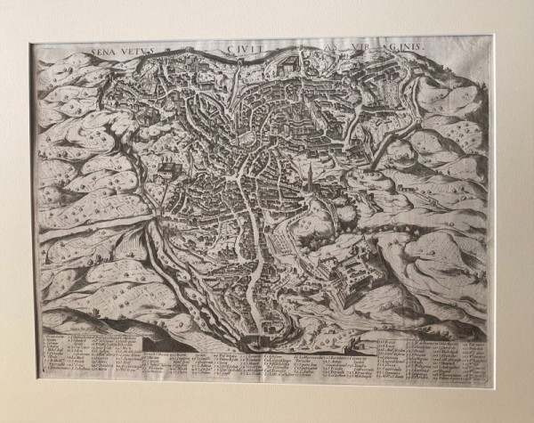 Incisione orginale eseguita all'acquaforte su rame e impressa su carta pesante e piuttosto granulata, vergellata. Tiratura della fine del secolo XVII. Titolo in lastra al centro del margine superiore; in basso a sinistra sempre in lastra, firma dell'autore "Matteo Flor. for." ; al disotto della parte figurata, legenda di 17 colonne con ben 119 richiami. Pianta propettica di Siena, derivante dal modello disegnato da Francesco Vanni e pubblicato da Peter de Jode nel 1597. La stampa in esame potrebbe essere uno degli esemplari, in tiratura tarda, pubblicati dall'editore Pietro Petrucci, che acquisì da Florimi le lastre delle sue vedute. Tavola pubblicata in una rarissima raccolta di vedute di città italiane da Matteo Florimi, importante editore senese, calabrese di origine che si stabilì in Toscana nel 1581 dove operò fino almeno al 1612, fu un editore di straordinaria importanza per la pubblicazione di piante e vedute di città rivisitate secondo le architetture nascenti e sino allora inedite. Fu allievo di Antoine de Lafrery e Claude Duchet, Esemplare in buone condizioni, inchiostratura leggermente chiara dovuta alla tiratura tarda; abilissimo risarcimento di alcune lacune a forma di mezzaluna alla parte superiore, di qualche cm ciascuna; buoni i margini laterali, piccoli quelli superiore e inferiore.