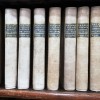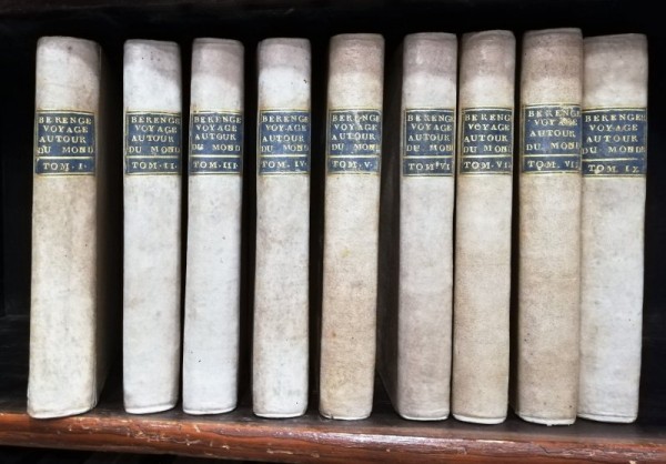 Legatura coeva in piena pergamena rigida; dorso liscio recante tassello azzurro con curatore, titolo e numero di tomo, il tutto impresso in oro; tagli spruzzati di rosso. (VI) - 412; (4) - 450; (2) - 392; (2) - 408; (2) - 376; (2) - 367 - (1); (2) - 346; (2) - 391; (29) - 447 pagine numerate, compresi l'occhietto del primo tomo, bell'antiporta con scena figurata all'acquaforte e frontespizio in apertura di ciascun volume. Pp. 33-48 del I volume collocate erroneamente tra pp. 16 e 17. Mancanza del X e ultimo tomo. Testo in lingua francese; bei fregi tipografici a silografia. All'inizio del I volume, una bella tavola fuori testo incisa su rame e impressa su foglio ripiegato bianco al verso, raffigurante i due emisferi del mappamondo. Al foglio di guardia superiore dei volumi, nota di possesso vergata a penna con grafia antica. L'opera è un'interessante raccolta, comprendente relazioni di viaggi attorno al mondo compiute da navigatori europei. L'impressione in esame è forse identificabile in quella menzionata da Brunet, che tuttavia cita come luogo e anno di stampa solo "Paris 1788" e segnala la presenza di un decimo volume, assente nell'esemplare in esame. Nei testi sono narrate le avventure di Magellano, sir Francis Drake e vari altri viaggiatori, spesso citati in forma francesizzante e approssimativa: T. Cavendish, Olivier de Noort, George Spilberg. Jacques le Maire, Jacques l'Hermite, Capitaine Clipperton, Gemelli Carreri, Capitaine Shelvock, Dampier, Cowley, Woode Rogers, M. le Gentil, Commodore Anson, Capitaine Wallis, Roggewin, Commodore Byron, Capitaine Carteret, Pagès, Bougainville, Surville. I tomi VII-IX sono interamente dedicati ai viaggi del capitano Cook. Accurati e di un certo interesse iconografico sono gli antiporta, raffiguranti episodi dei viaggi narrati. Esemplare in ottimo stato conservativo, minimo distacco del dorso del primo volume, considerata la segnalata mancanza di un tomo; interno fresco salvo alcune carte brunite o con gore d'umidità.