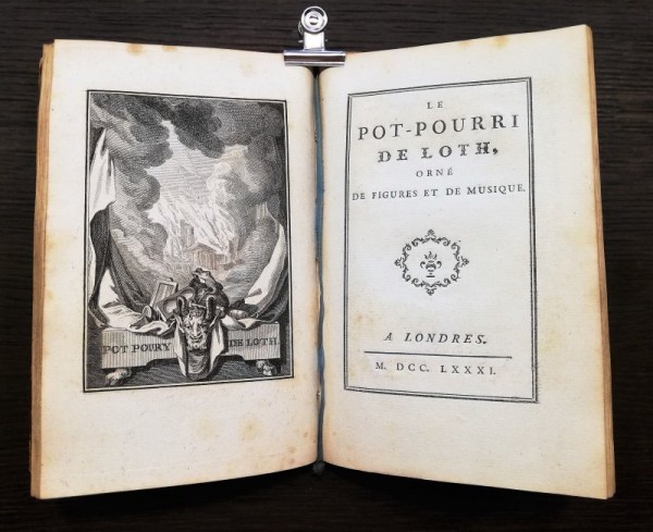 Legatura coeva in piena pelle maculata, piccola cornicetta impressa in oro ai piatti, dorso a sei nervi con tassello e titolo in oro e fregi in oro, sguardie marmorizzate. Occhietto, antiporta incisa e figurata; 10 carte numerate compreso il frontespizio e impresse al solo verso; 8 illustrazioni a piena pagina fuori testo; 8 pagine numerate di spartiti musicali. Seguono occhietto, antiporta figurata, 10 carte numerate, incluso il frontespizio e impresse al solo verso; 8 illustrazioni a piena pagina fuori testo; 1 carta di colophon non numerata con verso bianco. Seguono 12 pagine numerate di spartiti musicali. In totale 2 frontespizi e 16 figure di Borel incise da Elluin, molte delle quali molto libere. L'opera, interamente incisa e alquanto insolita, è una raccolta di canzoni licenziose. Prima rara edizione a cui ne seguì una seconda l'anno successivo. Segni di usura alla legatura, con fenditure ai piatti richiuse, spellature agli angoli; interno fresco con consueti lievi segni di ossidazione alle carte.