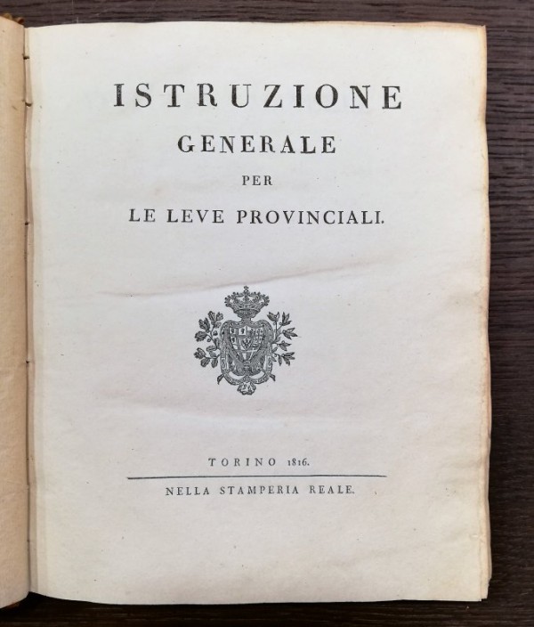 Legatura in piena pelle maculata, sguardie maculate. Frontespizio con stemma sabaudo inciso, dedica, 143 pagine numerate. In seguito all'editto promulgato da Vittorio Emanuele I il 16 febbraio 1816, atto a stabilire le basi di un nuovo sistema di leva in cui tutte le classi concorressero a formare l'armata reale, fu fatta pubblicare questa Istruzione Generale per dare uno sviluppo ordinato al suddetto editto, coll'aggiunta di alcuni provvedimenti per "assicurare la regolare sua applicazione". Esemplare in buone condizioni, su carta forte, ad ampi margini e in barbe.