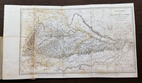 Legatura originale in mezza pelle e carta maculata; al dorso, fregi e titolo in oro su tassello rosso, tagli spruzzati di marrone. Occhiello, frontespizio, 433 pagine numerate, 2 pagine non numerate per Table des Matières e Errata, 8 tavole fuori testo, litografate con interventi coevi all'acquerello e più volte ripiegate. Opera monografica contenente una dettagliata relazione sulla campagna militare francese in Germania del 1800, corredata da molti documenti. Le accurate tavole fuori testo sono eseguite in litografia da Engelmann. L'opera si divide in due parti: la prima, sulla campagna d'estate, la seconda, sulla campagna d'inverno. Esemplare in ottime condizioni, qualche lieve fioritura a poche carte.
