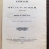 Legatura originale in mezza pelle e carta maculata; al dorso, fregi e titolo in oro su tassello rosso, tagli spruzzati di marrone. Occhiello, frontespizio, 433 pagine numerate, 2 pagine non numerate per Table des Matières e Errata, 8 tavole fuori testo, litografate con interventi coevi all'acquerello e più volte ripiegate. Opera monografica contenente una dettagliata relazione sulla campagna militare francese in Germania del 1800, corredata da molti documenti. Le accurate tavole fuori testo sono eseguite in litografia da Engelmann. L'opera si divide in due parti: la prima, sulla campagna d'estate, la seconda, sulla campagna d'inverno. Esemplare in ottime condizioni, qualche lieve fioritura a poche carte.