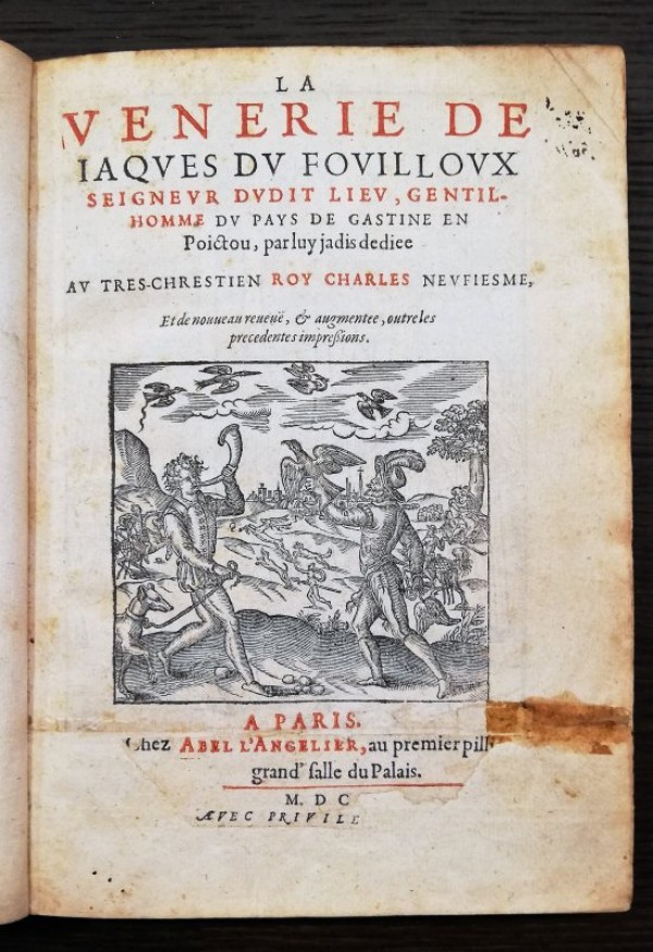 - LA VENERIE DE IAQUES DU FOUILLOUX SEIGNEUR DUDIT LIEU, GENTILHOMME DU PAYS DE GASTINE EN POICTOU, PAR LUY JADIS DEDICE AU TRES-CHRESTIEN ROY CHARLES NEUEIESME, ETE DE NOUVEAU RENEUË, ET AUGMENTEE, OUTRE LES PRECEDENTES IMPRESSIONS.FOUILLOUX Jaques, du (1519-1580)
