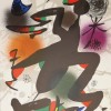 Litografia originale a colori realizzata da Joan Mirò per il portfolio "Mirò Lithographe Volume III", composto di 5 tavole oltre a quella in esame. Il volume, pubblicato nelle edizioni Weber a Ginevra nel 1977, raccoglie tutte le opere realizzate da Mirò mediante la tecnica litografica tra il 1964 e il 1969. Joan Mirò, pittore ceramista, disegnatore, incisore e scultore spagnolo nasce a Barcellona , nel 1912 si dedica esclusivamente alla pittura , frequentando la Scuola di Francesc Galì, si iscrive al Circolo Artistico di Sant Luc dove incontra Joan Prats. Nel 1914 Mirò entra a far parte della scuola d'Arte di Barcellona, scopre il " fauvuisme" ed espone alla galleria Dalmau. Successsivamente si trasferisce a Parigi dove incontra il connazionale Picasso ed entra a far parte del Circolo Dada di Tristan. Alla fine della prima Guerra Mondiale, Miro' compone dei paesaggi realisti, la sua arte evolve all'inizio degli anni '20, verso uno stile immaginario che sfocia nel surrealismo. Nel 1921 affitta il vecchio atelier dello scultore catalano Gargallo ed ottiene la sua prima esposizione personale a Parigi ; è questo per lui un periodo di grande povertà. Le sue opere si popolano di pittogrammi che possono leggersi come un codice specifico all'artista. Dal 1925 al 1927, i suoi quadri diventano onirici e spogli, come liberati dalla forza di gravità e richiamati dagli astri. Miro' realizza anche un insieme di quadri-poesia, poi lavora dal 1926 al 1927, su una serie di paesaggi immaginari in cui la natura irrompe nel fantastico. Servendosi di differenti materiali (cortecce, filacce, assemblaggi di oggetti, etc.), Miro' realizza dei quadri-collages che, lui stesso, definisce "anti-pittura". Nel 1932, espone a Parigi e a New York ed incontra Kandinky, durante la guerra civile spagnola, Miro' dipinge quelle che definisce lui stesso "pitture selvagge". Nel 1937, realizza una pittura murale per il padiglione della Spagna all'Esposizione Universale di Parigi. All'inizio della seconda Guerra Mondiale, l'artista si rifugia in Spagna, poi raggiunge Parigi all'inizio del 1942. Durante la guerra, continua la sua ricerca di una rappresentazione poetica e dipinge l'insieme "Les Constellations" . Impiega per questo frangente delle tecniche rudimentali (spazzola, raschiatura, velatura, etc.) ; inventa parallelamente la sua scrittura creativa (palle stellate, spire, linee spezzate, etc.) ; la donna, l'uccello, la stella, diventano delle figure ricorrenti nella sua opera. Nel 1944 Miro' inizia a realizzare delle sculture in bronzo di piccolo formato e si interessa anche alla ceramica. L'opera grafica di Miro' è altrettanto importante che le successive sintesi artistiche con testi o poesie ; in questo ambito, per esempio, nel 1947, illustra "A toute épreuve" di Paul Eluard, e "Antitete" di Tristan . Joan Mirò muore a Palma di Majorca nel 1983 L'opera si presenta in buono stato conservativo, i margini sono in formato editoriale ed intonsi.