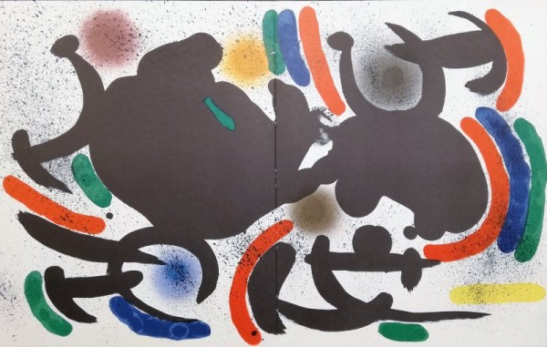 Litografia originale a colori realizzata da Joan Mirò per il portfolio "Mirò Lithographe Volume I". Il volume, pubblicato nelle edizioni Maeght a Parig nel 1972, raccoglie tutte le opere realizzate da Mirò mediante la tecnica litografica tra il 1930 e il 1952. Joan Mirò, pittore ceramista, disegnatore, incisore e scultore spagnolo nasce a Barcellona , nel 1912 si dedica esclusivamente alla pittura , frequentando la Scuola di Francesc Galì, si iscrive al Circolo Artistico di Sant Luc dove incontra Joan Prats. Nel 1914 Mirò entra a far parte della scuola d'Arte di Barcellona, scopre il " fauvuisme" ed espone alla galleria Dalmau. Successsivamente si trasferisce a Parigi dove incontra il connazionale Picasso ed entra a far parte del Circolo Dada di Tristan. Alla fine della prima Guerra Mondiale, Miro' compone dei paesaggi realisti, la sua arte evolve all'inizio degli anni '20, verso uno stile immaginario che sfocia nel surrealismo. Nel 1921 affitta il vecchio atelier dello scultore catalano Gargallo ed ottiene la sua prima esposizione personale a Parigi ; è questo per lui un periodo di grande povertà. Le sue opere si popolano di pittogrammi che possono leggersi come un codice specifico all'artista. Dal 1925 al 1927, i suoi quadri diventano onirici e spogli, come liberati dalla forza di gravità e richiamati dagli astri. Miro' realizza anche un insieme di quadri-poesia, poi lavora dal 1926 al 1927, su una serie di paesaggi immaginari in cui la natura irrompe nel fantastico. Servendosi di differenti materiali (cortecce, filacce, assemblaggi di oggetti, etc.), Miro' realizza dei quadri-collages che, lui stesso, definisce "anti-pittura". Nel 1932, espone a Parigi e a New York ed incontra Kandinky, durante la guerra civile spagnola, Miro' dipinge quelle che definisce lui stesso "pitture selvagge". Nel 1937, realizza una pittura murale per il padiglione della Spagna all'Esposizione Universale di Parigi. All'inizio della seconda Guerra Mondiale, l'artista si rifugia in Spagna, poi raggiunge Parigi all'inizio del 1942. Durante la guerra, continua la sua ricerca di una rappresentazione poetica e dipinge l'insieme "Les Constellations" .Nel 1944 Miro' inizia a realizzare delle sculture in bronzo di piccolo formato e si interessa anche alla ceramica. L'opera grafica di Miro' è altrettanto importante che le successive sintesi artistiche con testi o poesie ; in questo ambito, per esempio, nel 1947, illustra "A toute épreuve" di Paul Eluard, e "Antitete" di Tristan . Joan Mirò muore a Palma di Majorca nel 1983 .