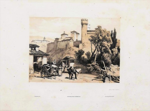 Stampa litografica originale impressa in seppia e nero; titolo, dati tipografici extra-margine inferiore. L'opera è ispirata ad un disegno di J. Harding, celebre pittore ed incisore inglese, allievo di Samuel Prout, ed eseguita da C. Hallmondal. Bella veduta prospettica della città piemontese di Ivrea, centro principale del canavese collocata sulla sinistra della Dora Baltea. L'insieme pittoresco delle torri del castello sabaudo, dei bastioni medioevali e la cattedrale, accoglie il viaggiatore, proveniente dalla valle d' Aosta, alle soglie della Porta Aosta ancora munita delle strutture difensive. In primo piano ferve il traffico dei viandanti e dei mercanti intorno alla fonte. Tavola tratta da importante raccolta di stampe a carattere vedutistico.Esemplare in buone condizioni conservative